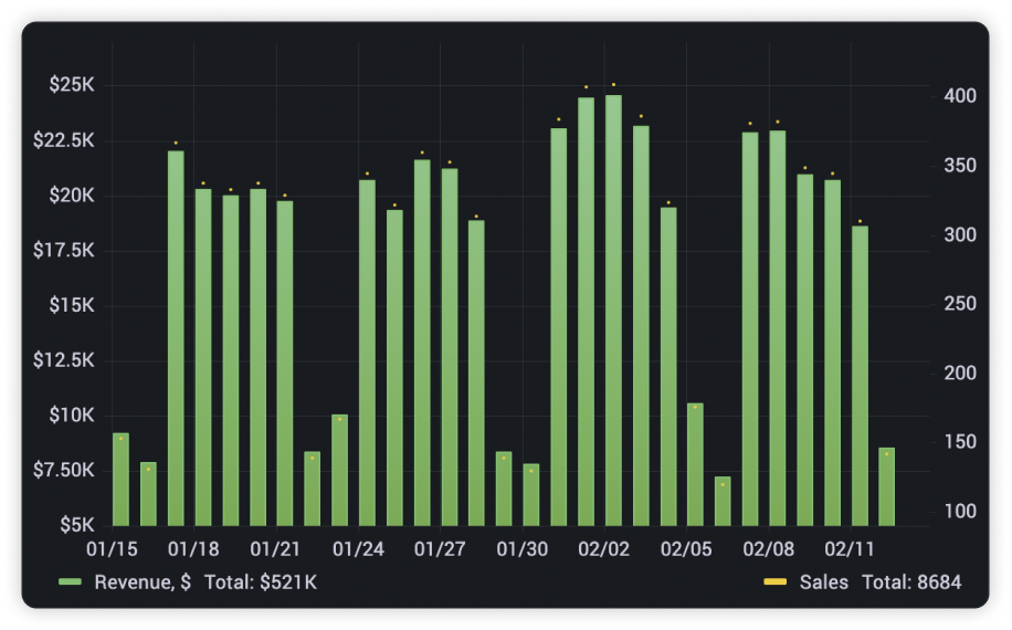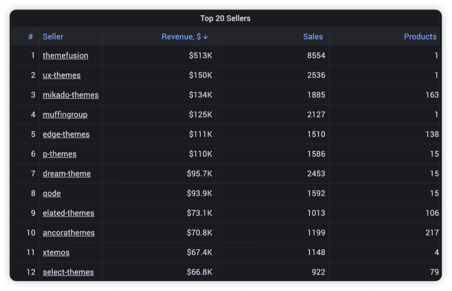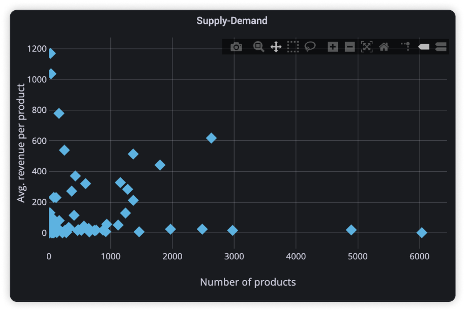 Revenue, sales, supply-demand, new products per day, avg. revenue/sales per product, revenue/sales percentiles, revenue distribution, top sellers/products and much more for all categories and tags in dynamics over a time period